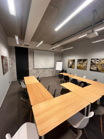 Plně vybavená zasedací místnost s moderním zařízením - plátno o velikosti 265x149, projektové pole. 2x apple TV, redukce k zařízení, mixážní pult - MICK 8, bezdrátové mikrofony, web kamery na online konference, stativy, denon profi audio systém.