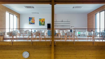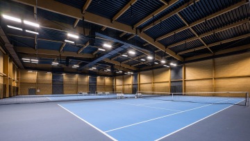 Dřevem obložená hala o rozloze 600 m² má k dispozici skybox s barem a posezením, 3 vnitřní kurty s povrchem GreenSet Comfort.