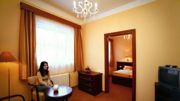 Vrcholem nabídky jsou 2 apartmány - Madame Curie a Premium. Pokoje jsou navíc vybaveny internetovým připojením, hudební věží s CD přehrávačem a výběrem hudby. Součástí nabídky je stravování v příjemném prostředí Modré restaurace s možností výběru á la carte a room servicem teplého nápoje zdarma.